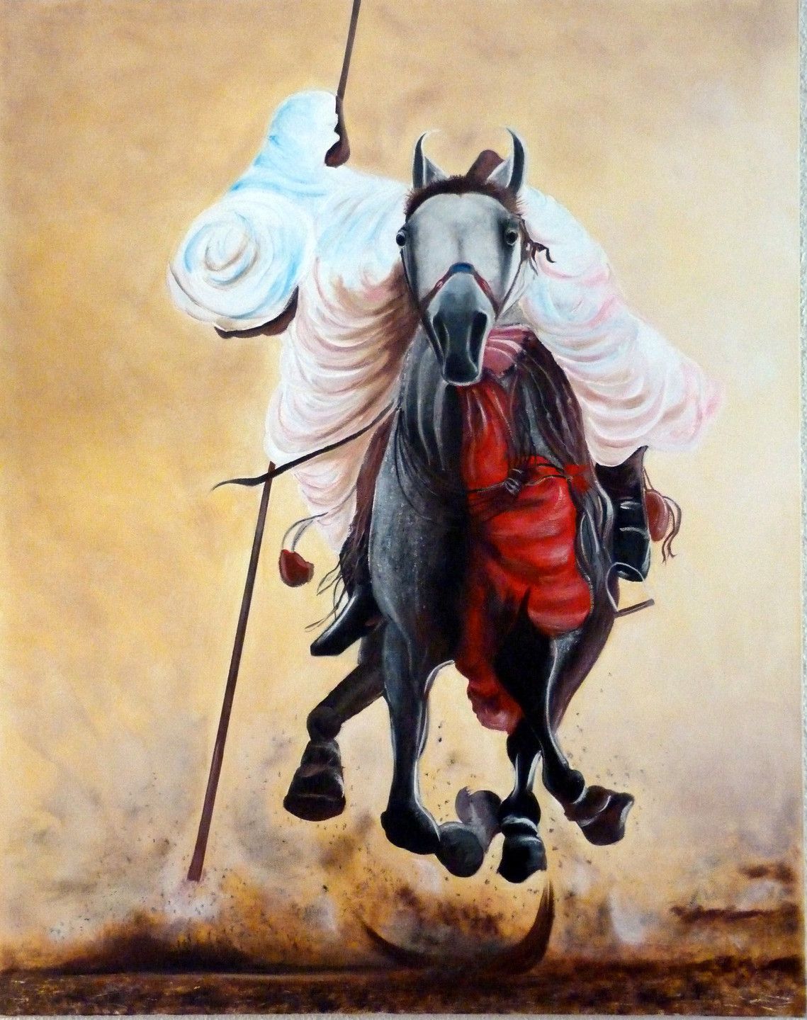Il est toujours bon de laisser se reposer un tableau puis y revenir quelques jous après. Ceci confirme la règle. le mouvement nétait pas assez riche mis à part le cheval. L'atmosphère demandait à être plus soutenu autour du cavalier et de sa monture.